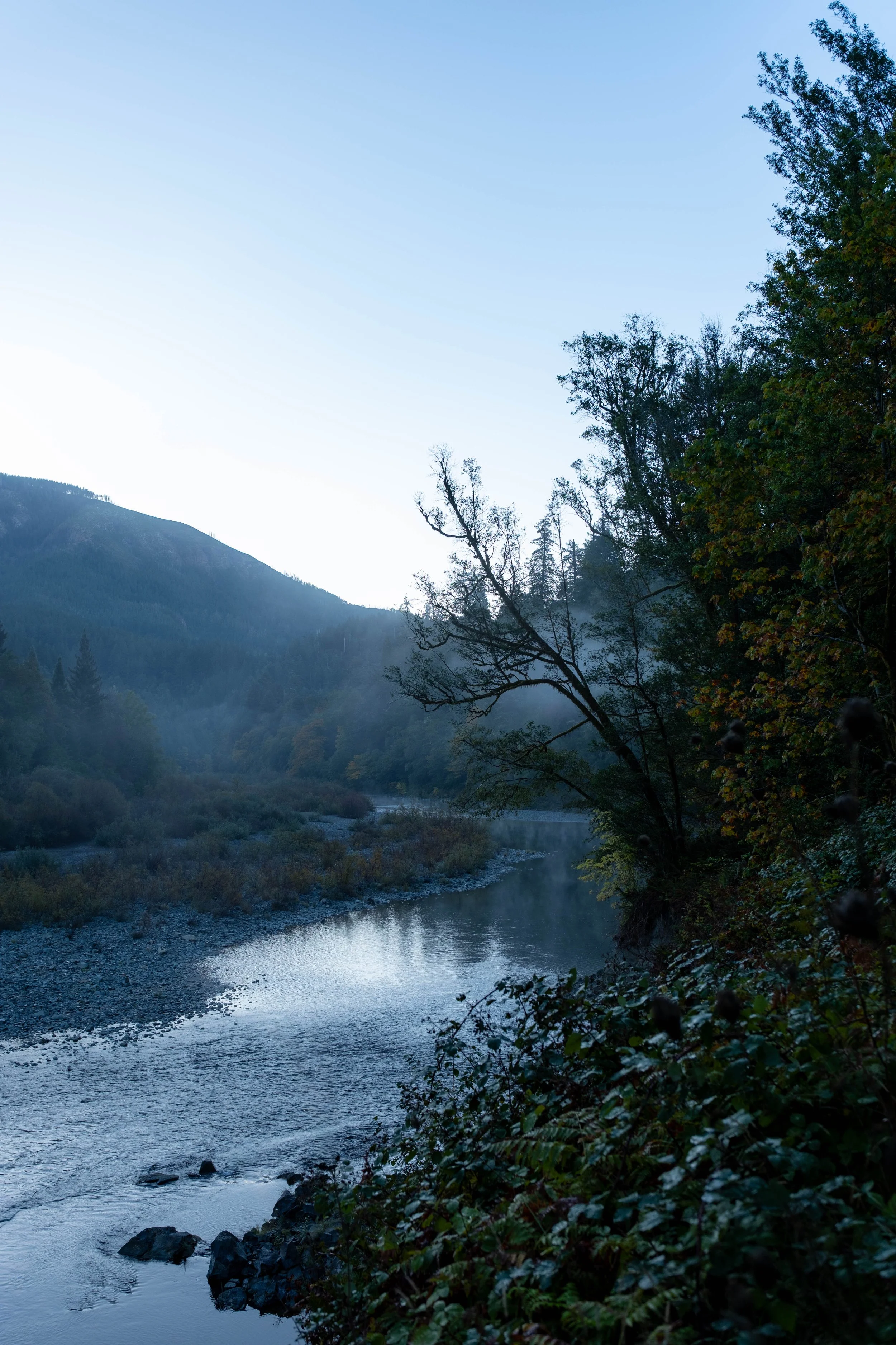 When I got to the trailhead, there was already a car parked, and I did indeed see the gentleman to whom it belonged having himself a morning trail run, likely before starting work. The forest was light enough that you could tell the sun had risen, but dark enough in places that you could tell no sunlight had reached it yet. At first, I was disappointed that there was no direct light, thinking about the amazing experience I had on the Simpon-Reed trail, but there was something truly magical about the serenity of the forest this early in the morning, still waking up.