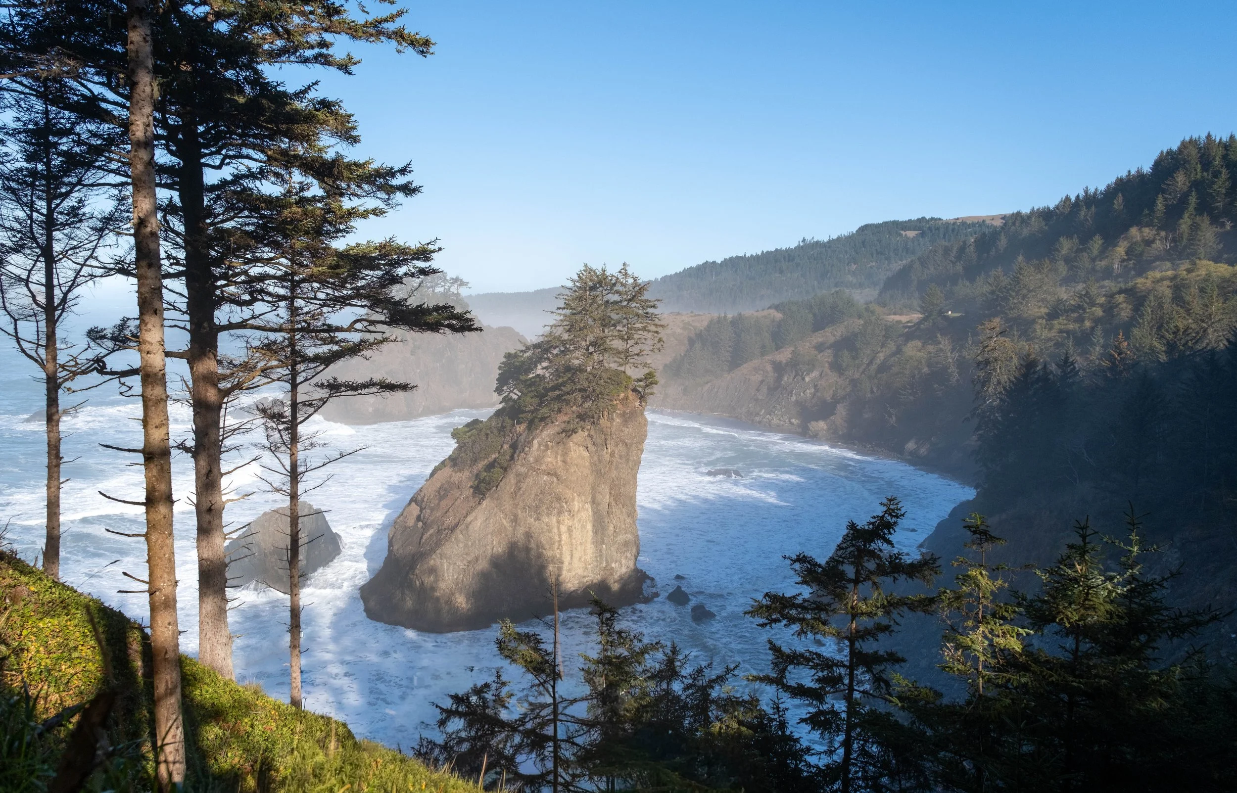 After my failed attempt at capturing Otter Point, I still had some time to kill before golden hour and sunset, and even in the harsh light, I knew I wanted to come back to Sisters Rock. I decided to drive a little further up the coast and do a short hike in Humbug Mountain State Park. As is so often the case, you think you’ve got it all perfectly timed only to find yourself rushing back to the car and sending some colorful words into the universe, hoping you’re not going to miss your window.